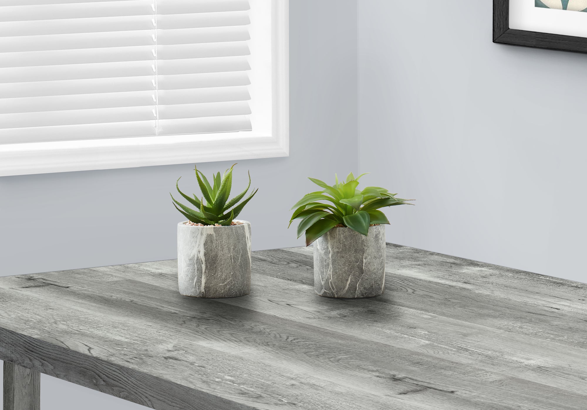 • Each set includes two 7" tall faux succulents nestled in 4" grey marble-look cement pots with pebbles for an effortless realistic look
