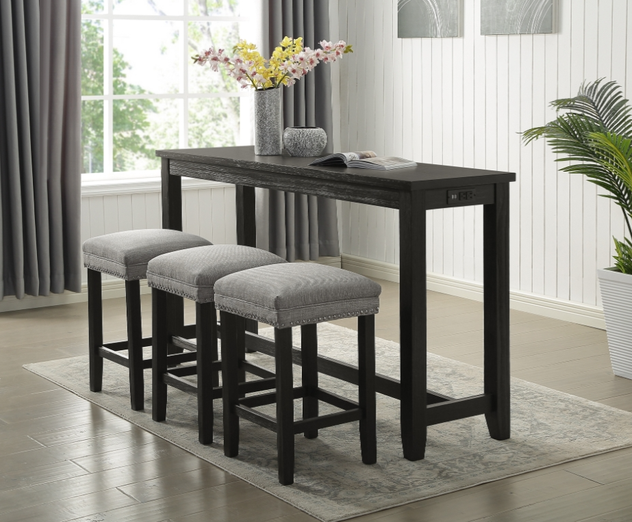 Small spaces call for smart solutions, and the Collection is exactly that. This convenient bistro set contains a counter height table and three matching counter height stools that tuck neatly underneath when not in use. Featuring a black finish over pine veneers and padded upholstered seats in grey textured linen-like fabric with silver nailhead trim, this collection's neutral palette and minimalist appearance is both practical and chic, and goes with absolutely everything. Not only that, but the table's sizing is versatile - large enough for meals or to work as a desk, but compact enough to double as a console or media table. Integrated USB ports and an A/C power outlet allows this handy set to function as a charging station, making it a true Jack of All Trades. No matter what you use it for, it has something to bring to your home.